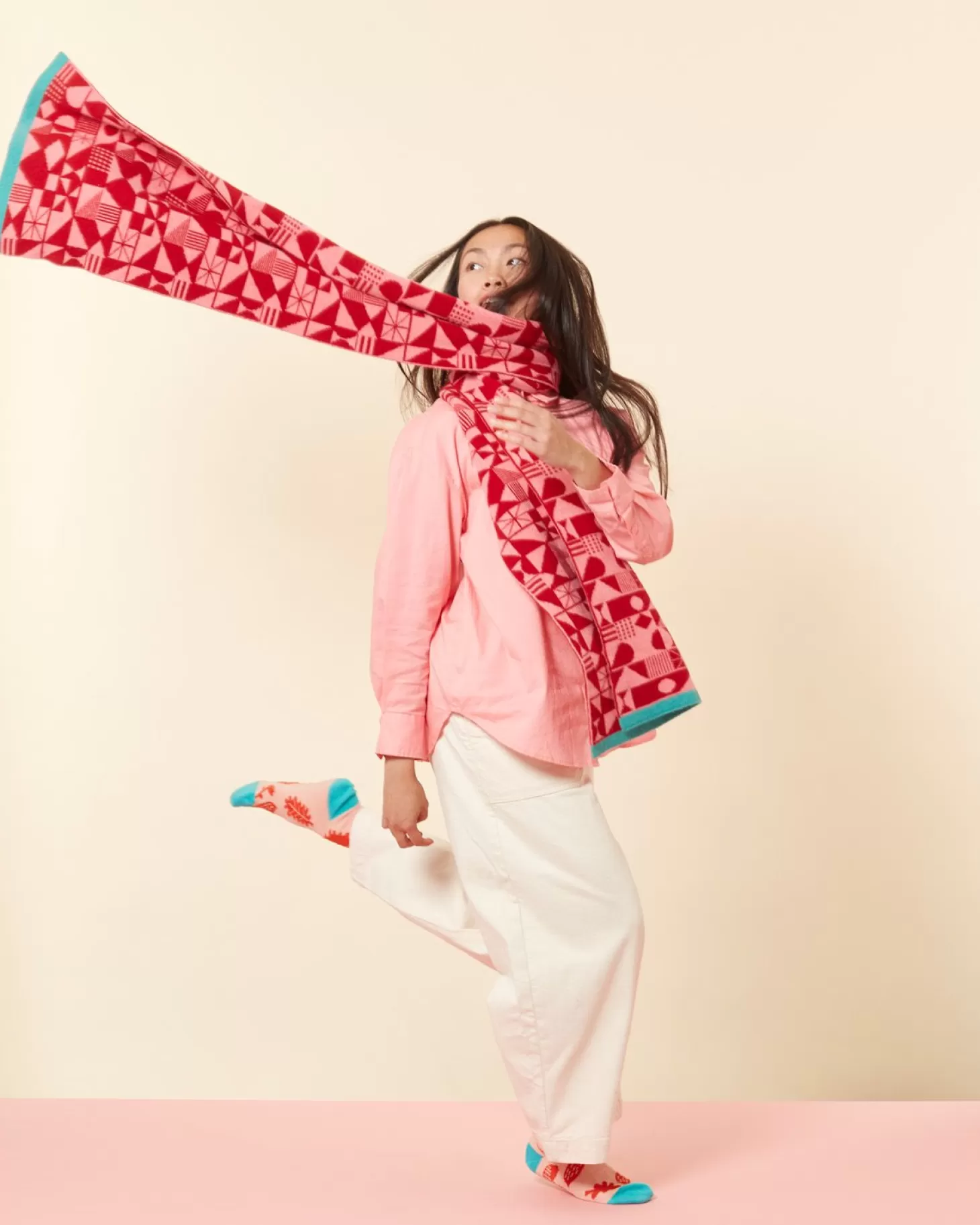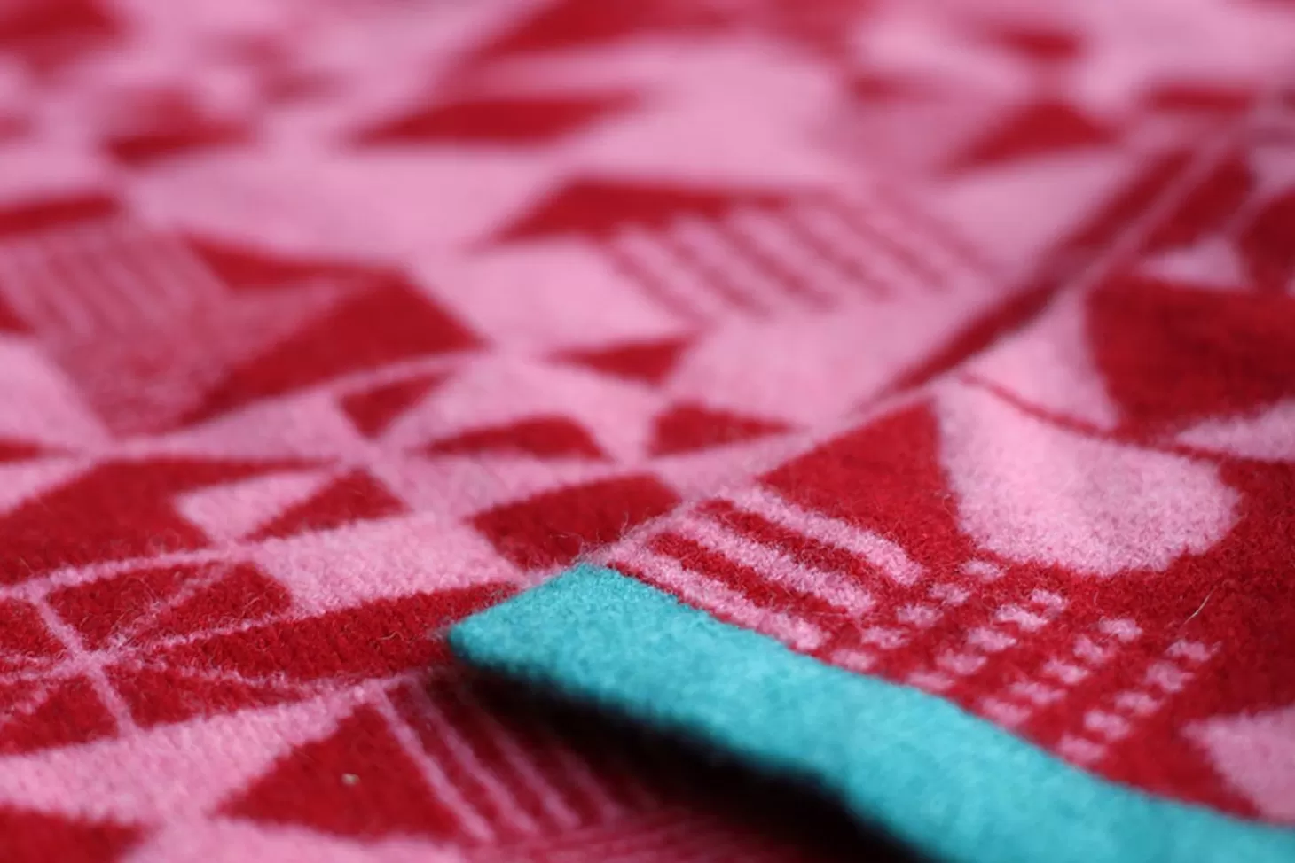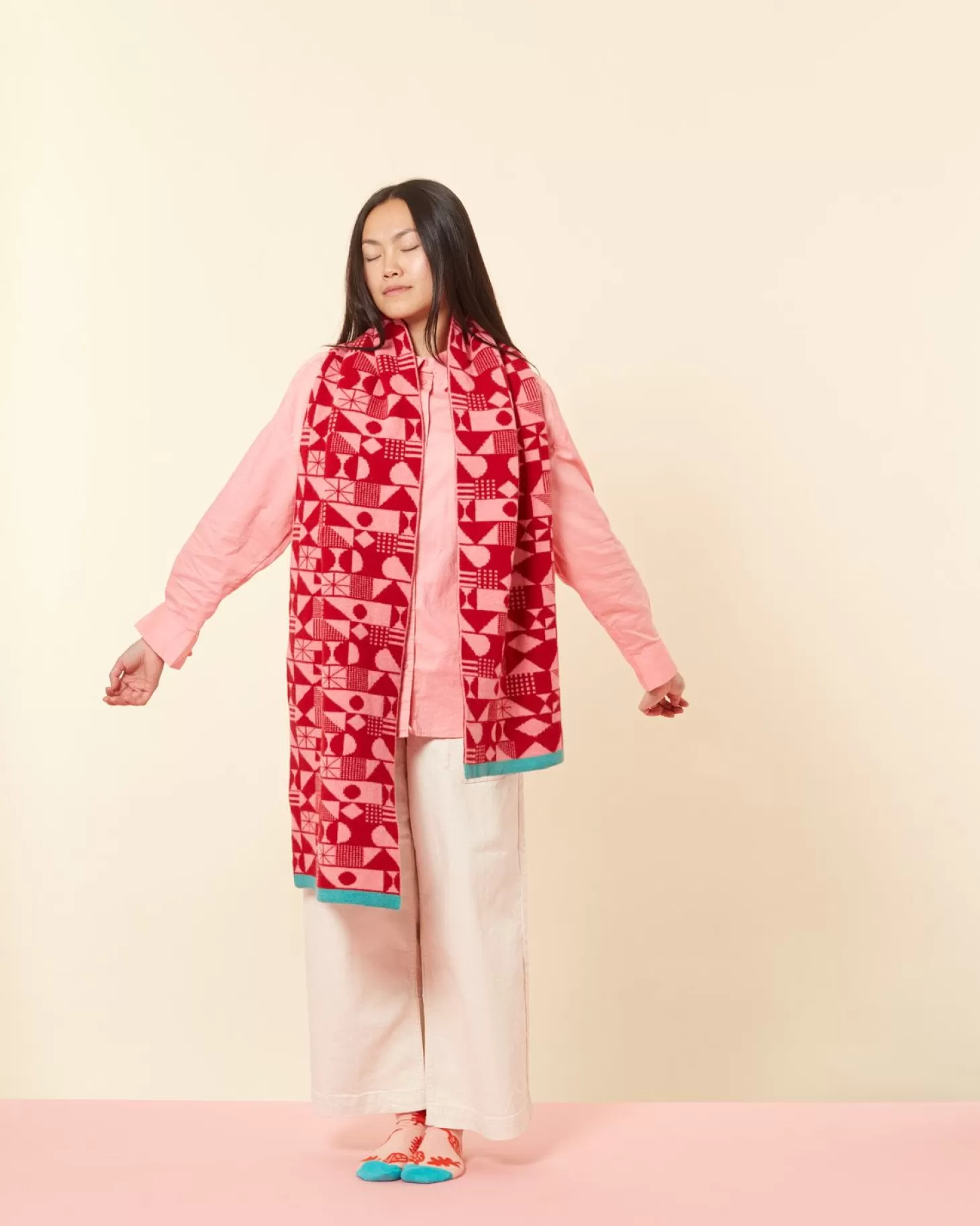 This Monoglyph Blanket Scarf Is A Colourful Clash Of Pink And Red, With A Contrasting Turquoise Trim.